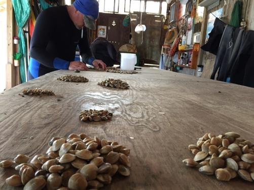 Da liegen die Muschel-Netze dann für ca 2 Monate, werden dann rausgeholt, die Muscheln werden in größere Netze gepackt und dann wieder ins Wasser gelegt. Es dauert so rund 6 Monate bis die Muscheln die essreife Größe erreicht haben. Wir waren heute beim Zwischenschritt dabei, also als die Netze mit den mittlerweile gewachsenen Muscheln reingeholt wurden, von anderen Tieren befreit wurden (Würmer, Krabben, Fische, Schrimps), gereinigt und in größere Netze verfrachten wurden. Morgen fährt Bobby mit seiner Crew wieder raus und legt die Muschelnetze wieder ins Wasser, wo sie dann wieder eine Weile liegen.