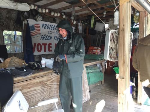Die gesäuberten, sortierten und gezählten Muscheln wurden dann wieder in neue Netze verfrachtet. Die alten Netze werden dann von anderen Mitarbeitern von Seetang und Seeschwämmen befreit und auch wiederverwendet. Dabei waren wir aber mehr im Weg als von Nutzen, daher wurden wir super nett von allen verabschiedet. Wir haben sogar noch eine Zeitschrift geschenkt bekommen, die auf die Schwierigkeiten von Muschel-Zucht in Florida aufmerksam macht. Captain Bobby ist öfter im Fernsehen oder in Zeitschriften erwähnt oder zu sehen, da er als einer der wenigen studierten Muschel-Fischer sich stark für die Unterstützung dieses Wirtschaftszweiges einsetzt.