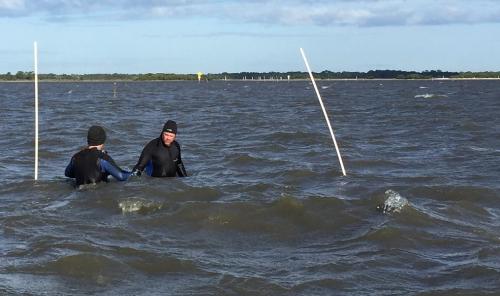 Die beiden Arbeiter von Bobby durften dann mit ihren Neopren-Anzügen ab ins Wasser und die Netze mit den Muscheln (eine helle Art der Miesmuschel würde ich tippen, die sogenannten Clams) einsammel. Diese waren aber nicht markiert, so dass immer wieder abgetastet wurde, welches Netz wo liegt und wie voll ist.