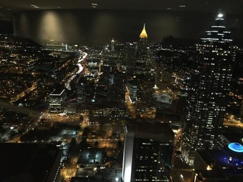 Aus einem meiner letzten Besuche in Atlanta wusste ich, dass es im Westin Peachtree, knapp dem höchsten Gebäude von Atlanta, oben eine Bar gibt, die sich dreht. Wir sind also ins Hotel und mit dem Glasfahrstuhl hoch in den 72 Stock. Der Ausblick war traumhaft.