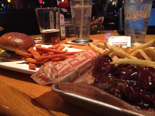 Da wir von diesem mächtigen Frühstück immer noch satt waren, gab es nur zwei Vorspeisen (Nachos mit Spinat-Artichocke-Dip und Mozarella-Sticks) und Budweiser.