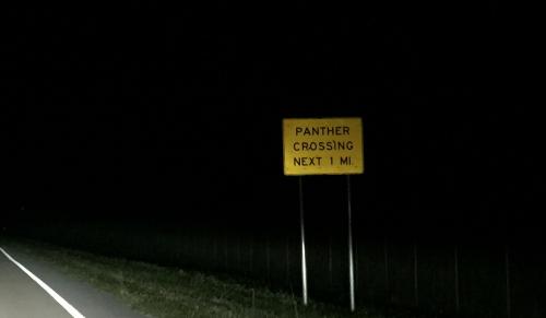 Ja, auch wir waren sehr erstaunt, aber hier unten gibt es in der Tat rund 200 braune wildlebende Florida-Panther. Wir hatten erheblichen Respekt davor, aus Versehen einen zu überfahren, dass wir im Schneckentempo weitergefahren sind und nun auch wieder hellwach waren. Aber es ist alles gut gegangen, wir haben keinen Panther gesehen.