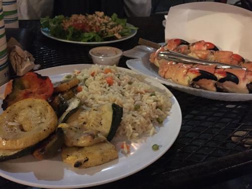Zu Essen gab es dann Spezialitäten aus der Region. Sebi hatte einen Salat mit Krokodil-Fleisch. Ich habe mich an die Krabben getraut, die es mit Grillgemüse und Reis gab. Beides war sehr gut, wobei die Krabben nicht einfach zu essen waren. Man musste die Scheren mit einem Nussknacker brechen und dann mit einem Piekser das Krabbenfleisch rauspulen. Es ist mir gelungen, aber ab und zu habe ich dann doch noch auf ein Stück Schale gebissen.