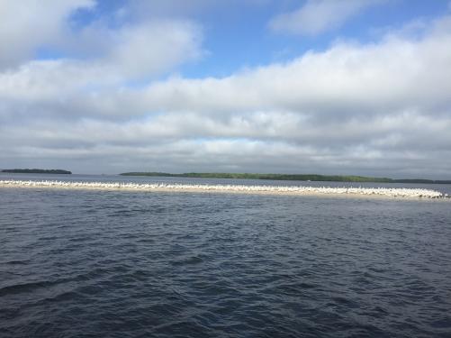 Weiter draußen, wo die kleineren Boote und die Paddler eher seltener hinkommen, haben wir dann die sogenannten ‚Snow-Birds‘ gesehen. Das ist keine spezielle Vogelart, sondern so werden die Vögel von den Park Rangern genannt, die im Winter aus dem Norden in den warmen Süden fliegen, um auf einer Mangroven Insel den Strand und die hier im flachen Wasser zu genüge zu findenden Fische für sich einzunehmen. Die Scharen dieser Vögel waren beeindruckend. Hier zum Beispiel eine Insel mit Unmengen an weißen Pelikanen