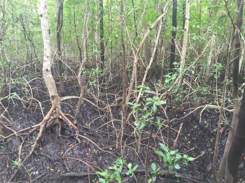 Hier mal noch eine Nahaufnahme der Mangroven, deren Wurzeln wie Strohhalme aus dem Boden wachsen, damit sie hierüber Luft ziehen können.